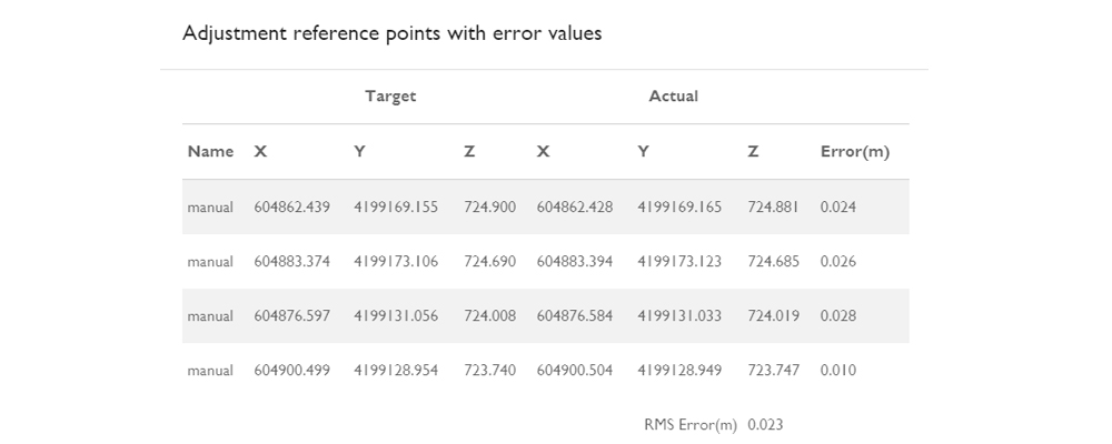 RMS raporunda da görebileceğiniz gibi Reference Plate aksesurarı ile referans noktaları oluşturup 2 cm hassasiyet ile nokta bulutlarını elde ettik. Nokta bulutu ile kordinat dönüşümü yerine cihazın yörünge dosyası ile referans noktalarını dengeleyerek normalde 8-10 cmlik hataları milimetre düzeyine indirgedik.